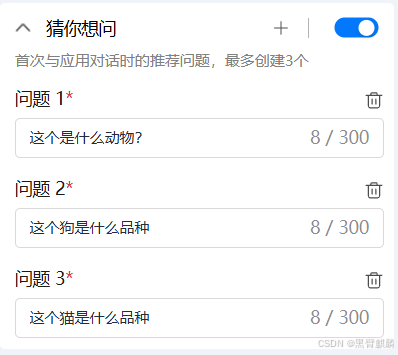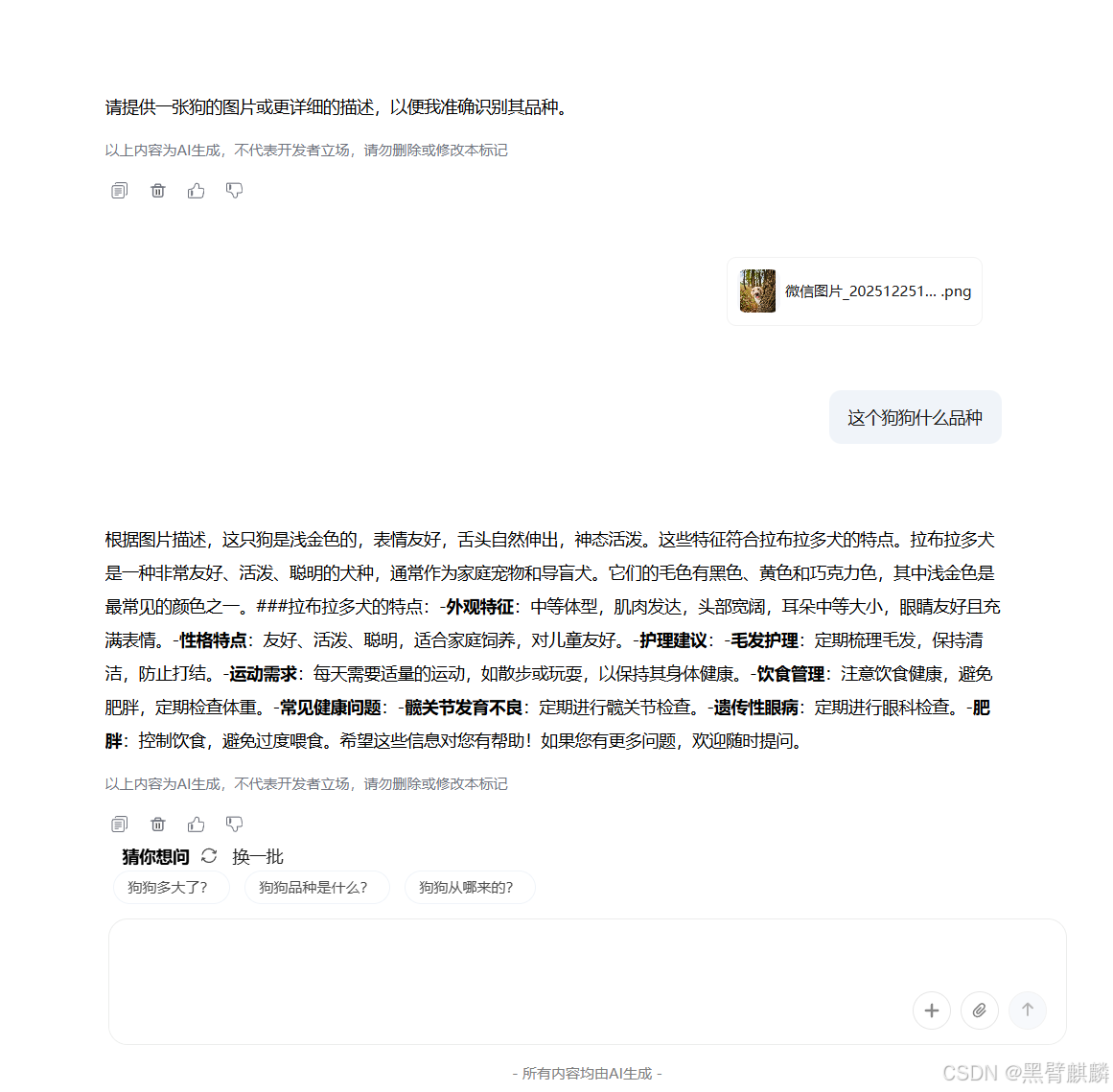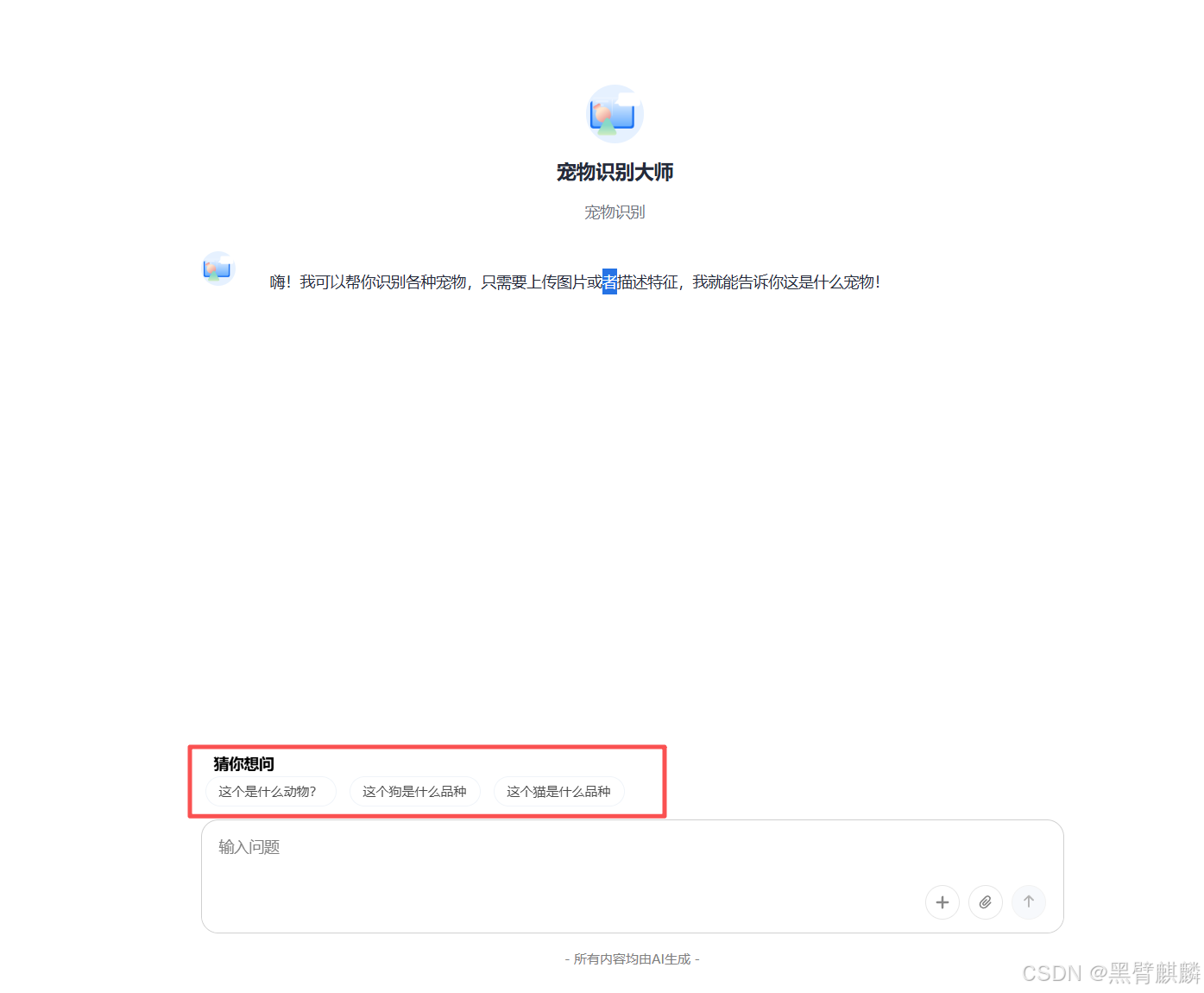 在开场白的基础上,可以更加人性化设置,提供"猜你想问"模块可以预设几个问题如:"这个动物是什么","这个狗是什么品种","这个猫什么品种"等等。