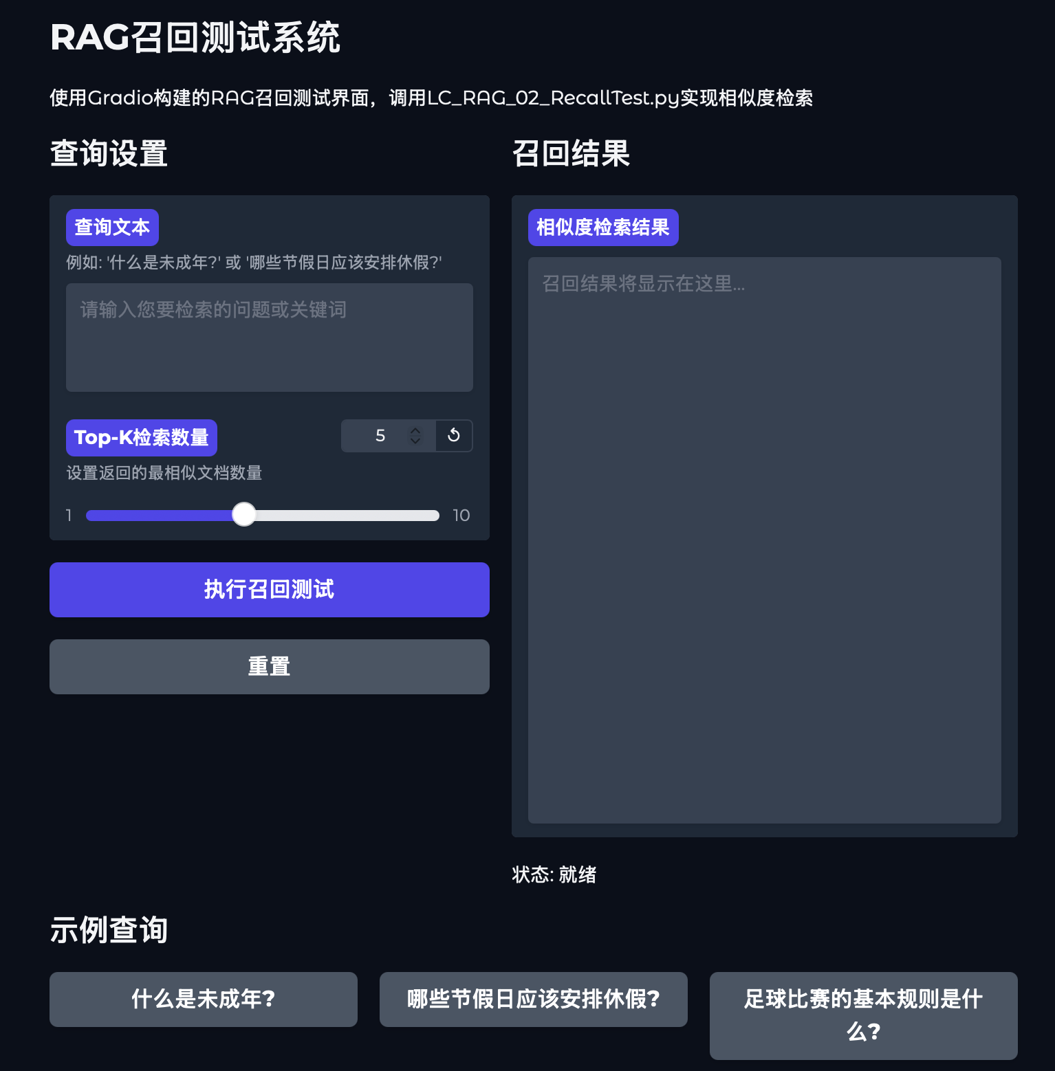 gr.Markdown("使用Gradio构建的RAG召回测试界面,调用LC_RAG_02_RecallTest.py实现相似度检索")
