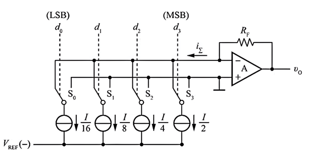 解决⽅法是采⽤权电流型 DAC,它有⼀组恒流源,每个恒流源电流⼤⼩依次为前⼀个的⼀半,与输⼊⼆进制对应位的权成正⽐。采⽤恒流