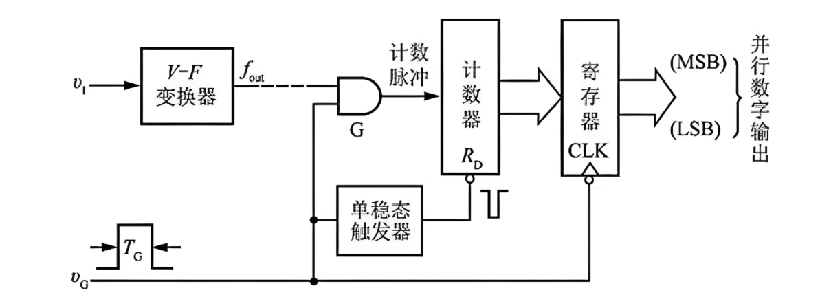 主要由 V-F 变换器(也称为压控振荡器 Voltage Controlled Oscillator,简称 VCO)、计数器及其时钟信号控制闸⻔、寄存器、单稳态触发器