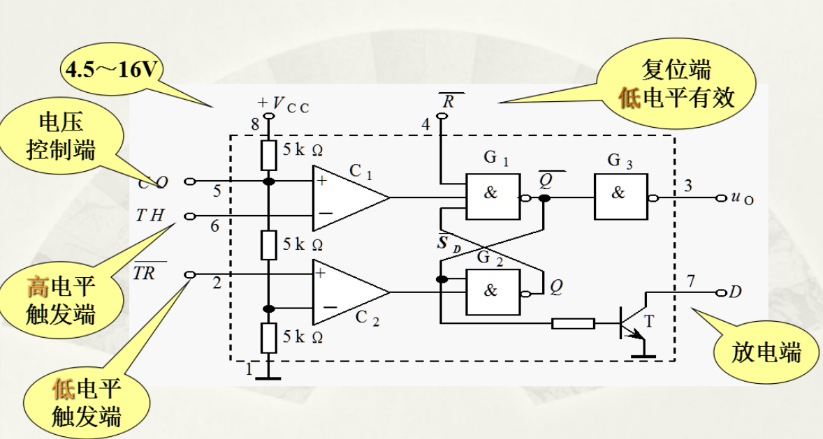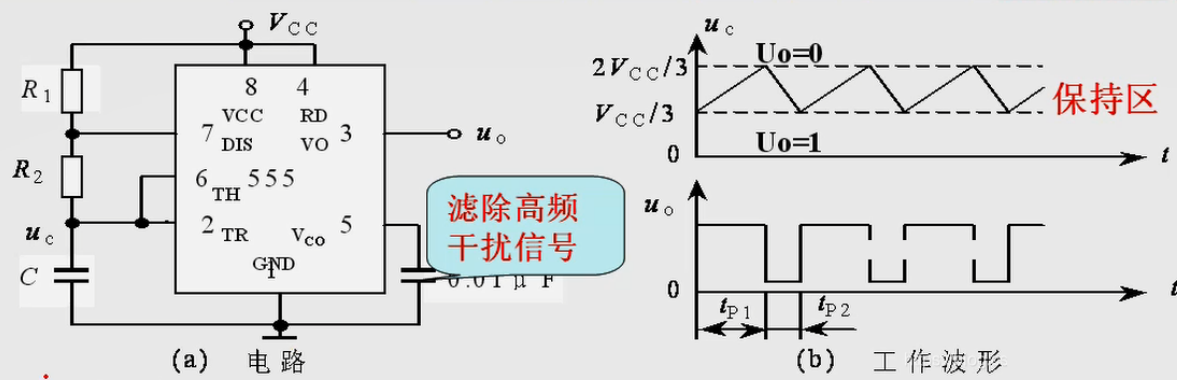 TR端是连接在⼀起的,刚开始是⼩于 1VCC/3,此时C1输出1,C2输出0,此时置位端有效,Q为1,Q⾮为0,uo为1,三极管截⽌,