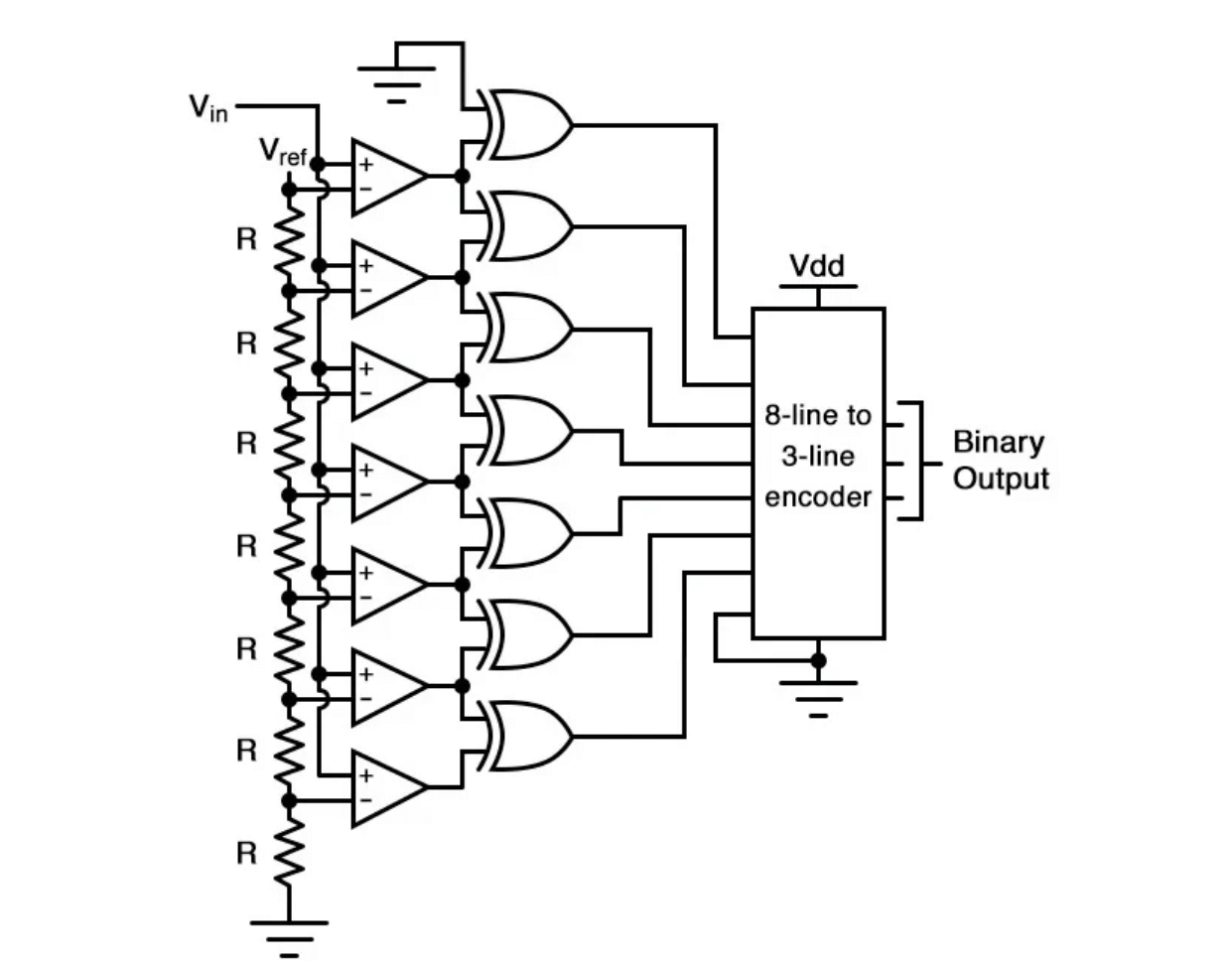 并联⽐较型 ADC ⼜称 Flash ADC,属于直接 ADC,能将输⼊的模拟电压直接转换为输出的数字量,不需要经过中间变量转换。它由⼀系