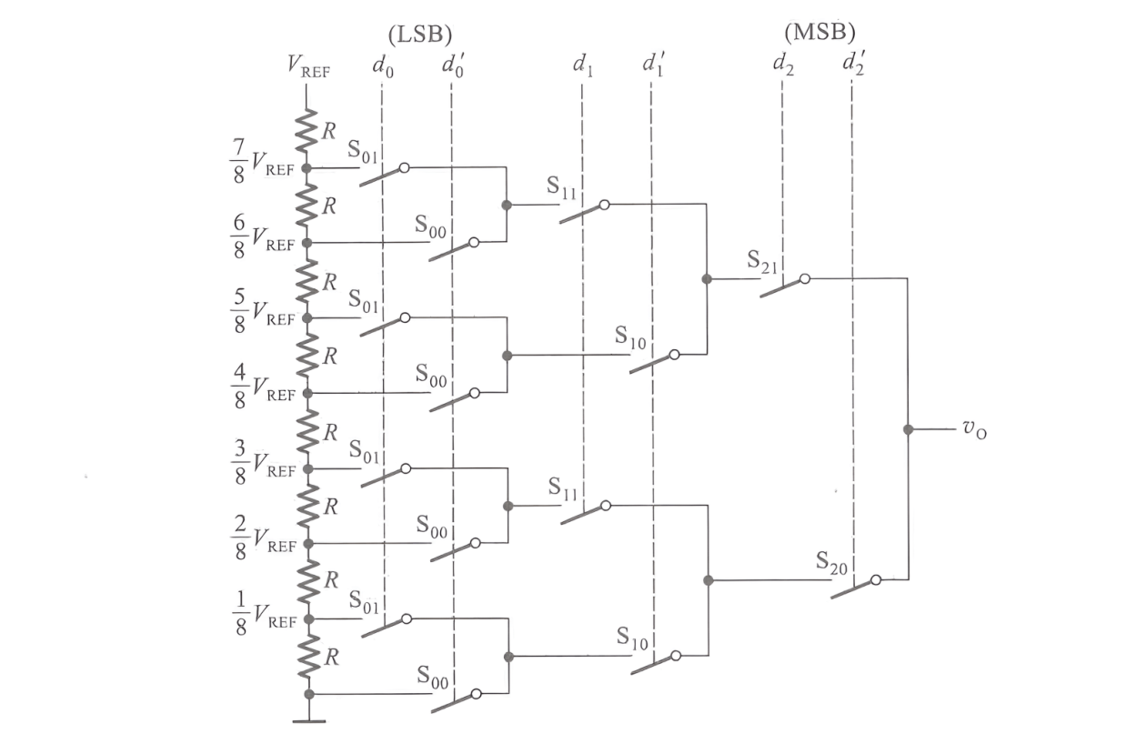 开关树型 DAC 是最简单粗暴的 DAC,由电阻分压器和树状的开关⽹络组成: