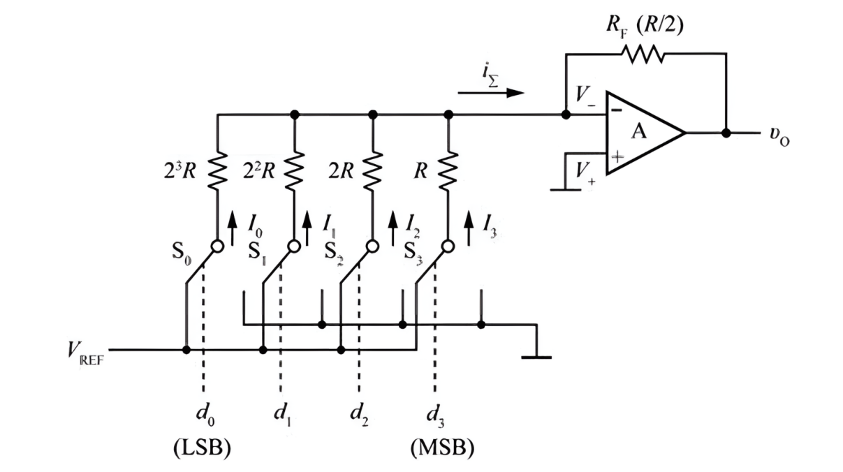 权电阻⽹络型 DAC(属于电压输出型)的原理如下图所⽰(4 位),它由权电阻⽹络,4 个模拟开关和 1 个求和放⼤器组成: