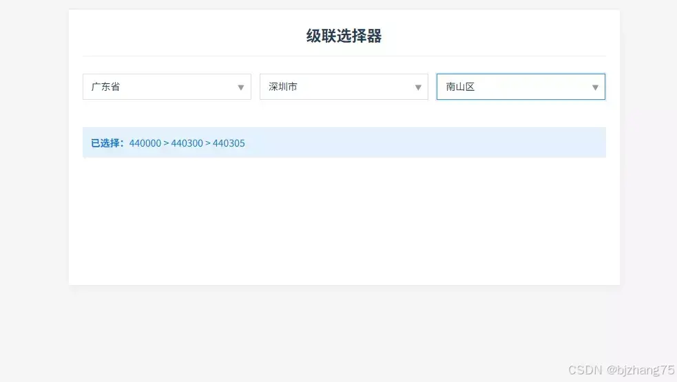 本系统实现了一个三级级联选择器,用户可以从省、市、区三个层级依次选择。