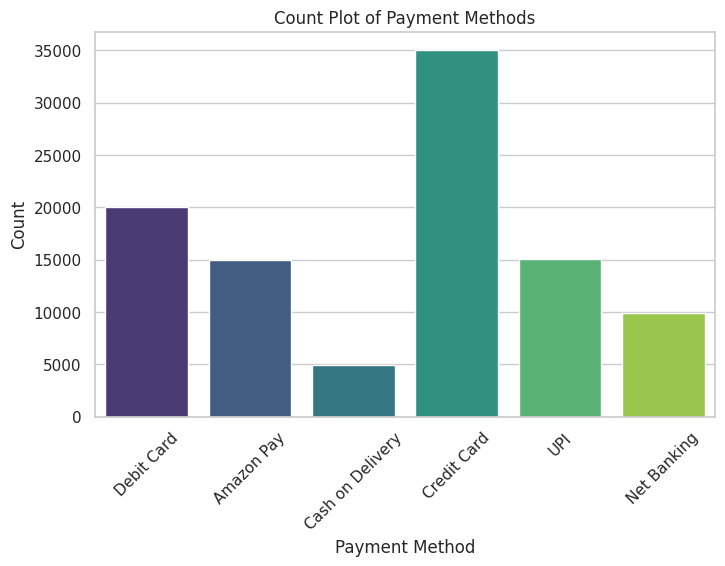 plt.title('Count Plot of Payment Methods')