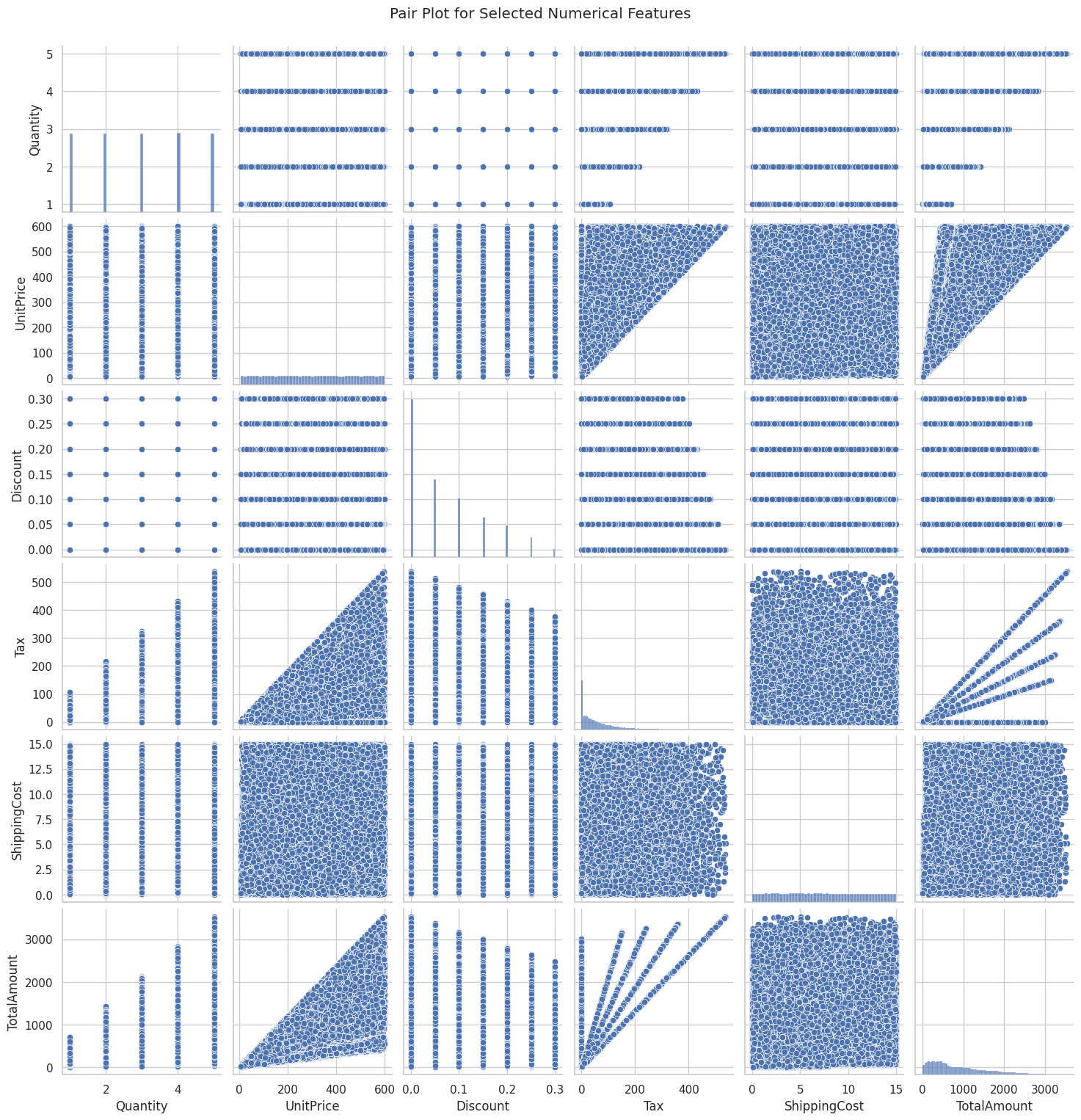 plt.suptitle('Pair Plot for Selected Numerical Features', y=1.02)