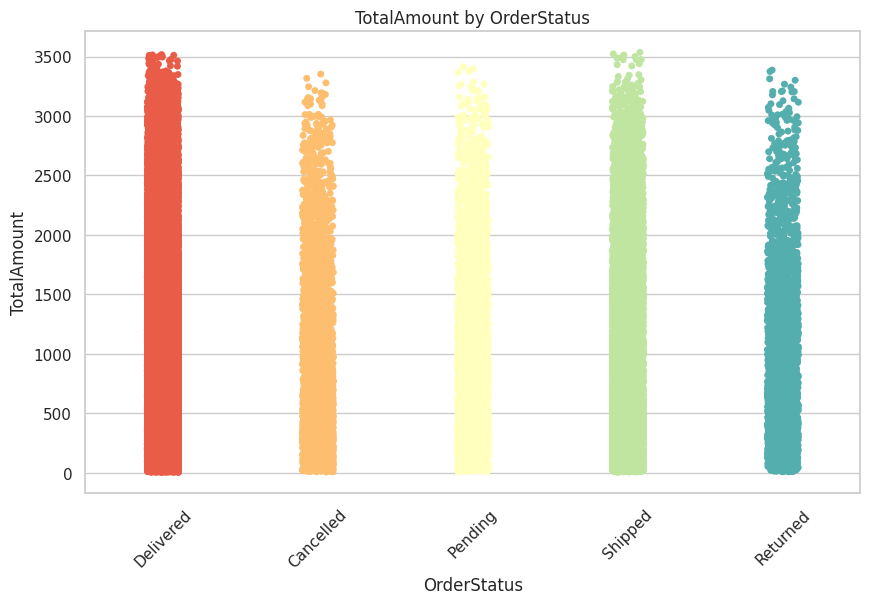 # Strip plot to show TotalAmount variation across different OrderStatus values