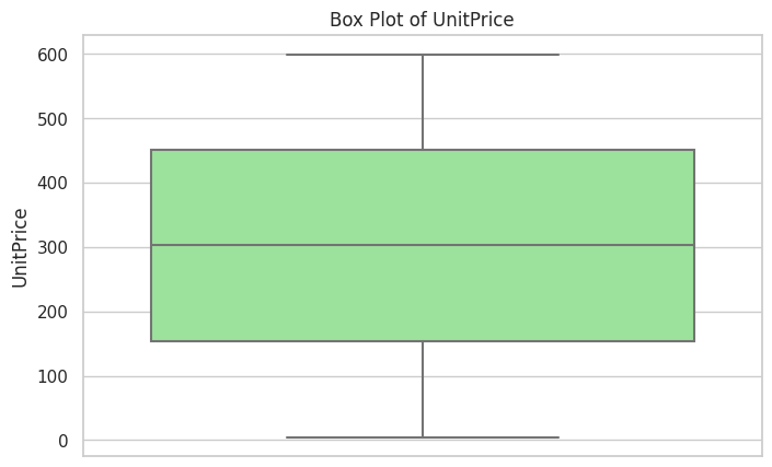 plt.title('Box Plot of UnitPrice')
