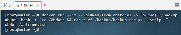 --volumes-from dbstore2挂载数据卷,并将宿主机当前目录挂载为容器内/backup。进入容器后切换至/dbdata目录,解压backup.tar.gz文件并使用--strip 1去除路径前缀,实现备份文件的正确还原,验证了跨容器数据恢复流程的有效性。