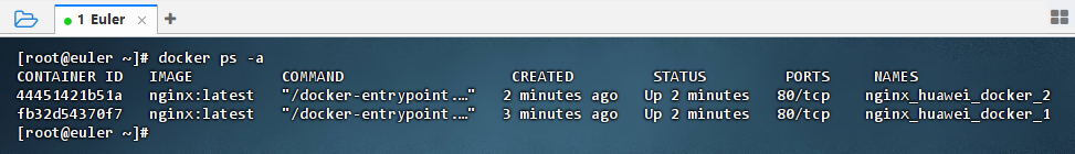 docker ps -a成功列出所有容器,显示两个 Nginx 容器nginx_huawei_docker_1和nginx_huawei_docker_2均处于运行状态(Up),分别映射了 80/tcp 和 90/tcp 端口。验证了容器创建与启动成功,且数据卷挂载配置正常,系统资源调度无异常。