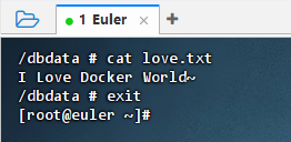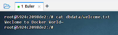--volumes-from dbstore2挂载其数据卷,成功进入容器环境。执行cat /dbdata/welcome.txt查看文件内容,输出为 "Welcome to Docker World!",验证了备份数据已正确恢复至/dbdata目录,说明数据持久化与恢复流程完整有效。