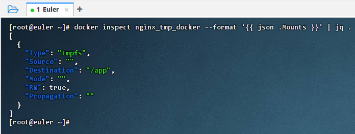 docker inspect nginx_tmp_docker --format '{``{ json .Mounts }}' | jq .成功提取并格式化容器的挂载信息,显示其使用 tmpfs 类型挂载,目标路径为/app,源为空(内存中),读写权限开启。验证了临时文件系统挂载配置正确,数据仅存于内存,重启即清空,适用于临时存储场景。