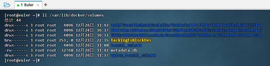 ll /var/lib/docker/volumes成功列出 Docker 数据卷目录,显示nginx_huawei_volume等卷的挂载点和权限信息,确认其在宿主机上的实际存储路径为/var/lib/docker/volumes/nginx_huawei_volume/_data,验证了数据卷持久化存储机制正常,文件系统结构完整。