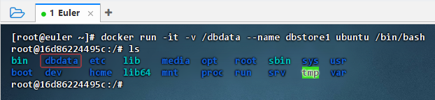 docker run -v /dbdata --name dbstore1 ubuntu /bin/bash,进入容器后,执行命令:ls