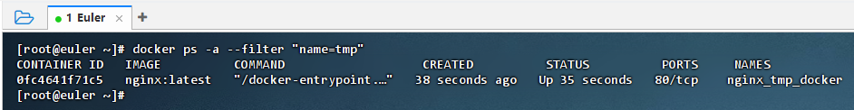 docker ps -a --filter "name=tmp"成功筛选出名称包含 "tmp" 的容器,显示nginx_tmp_docker正在运行(Up),映射 80/tcp 端口。验证了容器创建成功且命名过滤功能正常,表明临时存储类容器部署无误,系统可精准定位并管理此类实例。