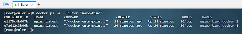 docker ps -a --filter "name=bind"成功筛选出名称包含 "bind" 的容器,显示nginx_bind_docker_1和nginx_bind_docker_2均处于运行状态(Up),并映射 80/tcp 端口。验证了绑定挂载容器部署正常,且通过命名过滤可精准定位特定类型容器,便于后续管理与维护。