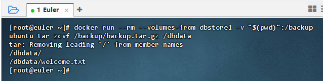 dbstore1容器中挂载的/dbdata目录打包为backup.tar.gz,并保存到宿主机当前目录。tar提示"Removing leading '/'"属正常行为,表示已去除绝对路径前缀以避免解压时覆盖系统文件,备份文件已生成,验证了基于--volumes-from的数据卷备份机制有效。 -