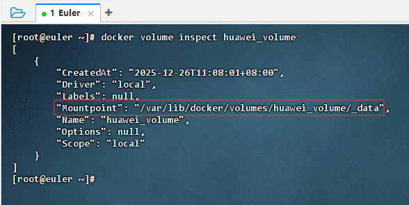 docker volume inspect huawei_volume成功获取该数据卷的详细信息,显示其驱动为local,挂载点位于/var/lib/docker/volumes/huawei_volume/_data,验证了数据卷在宿主机上的实际存储路径和配置属性,确保容器可安全持久化数据。