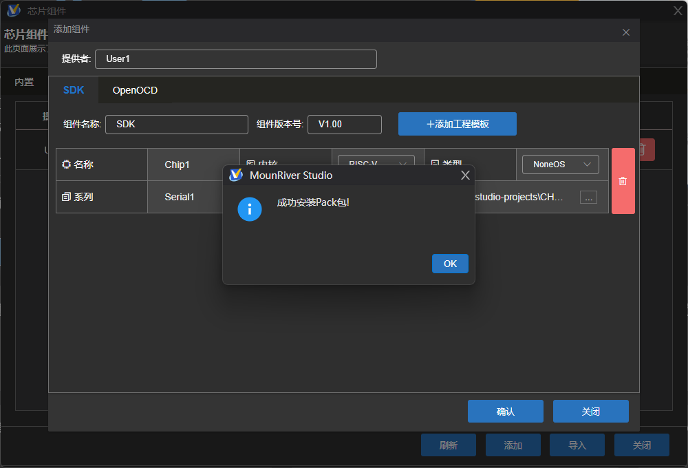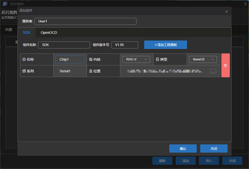 步骤三:选择"SDK"标签,填入提供者、组件名称、版本号、组件对应的芯片型号、系列号、模板源工程所在位置等信息,点击"确认"。可通过右上角添加按钮来添加多个模板工程,也可以用删除按钮去掉添加项,最后点击"确认"即可。