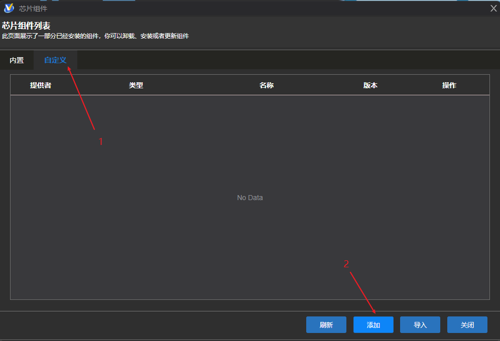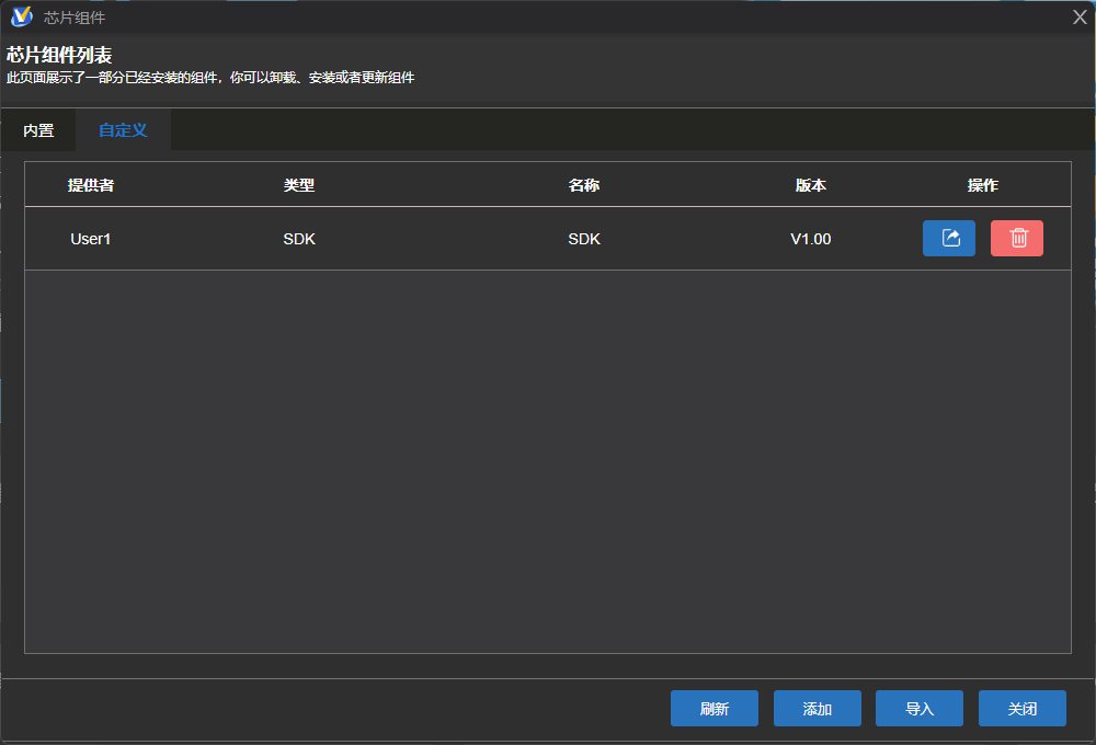 步骤四:看到弹出的组件包安装成功提示即可关闭添加组件页面,此时可以看到添加的SDK组件已经出现在列表中,可以通过界面上按钮来手动刷新该列表、导入、导出、删除组件包。