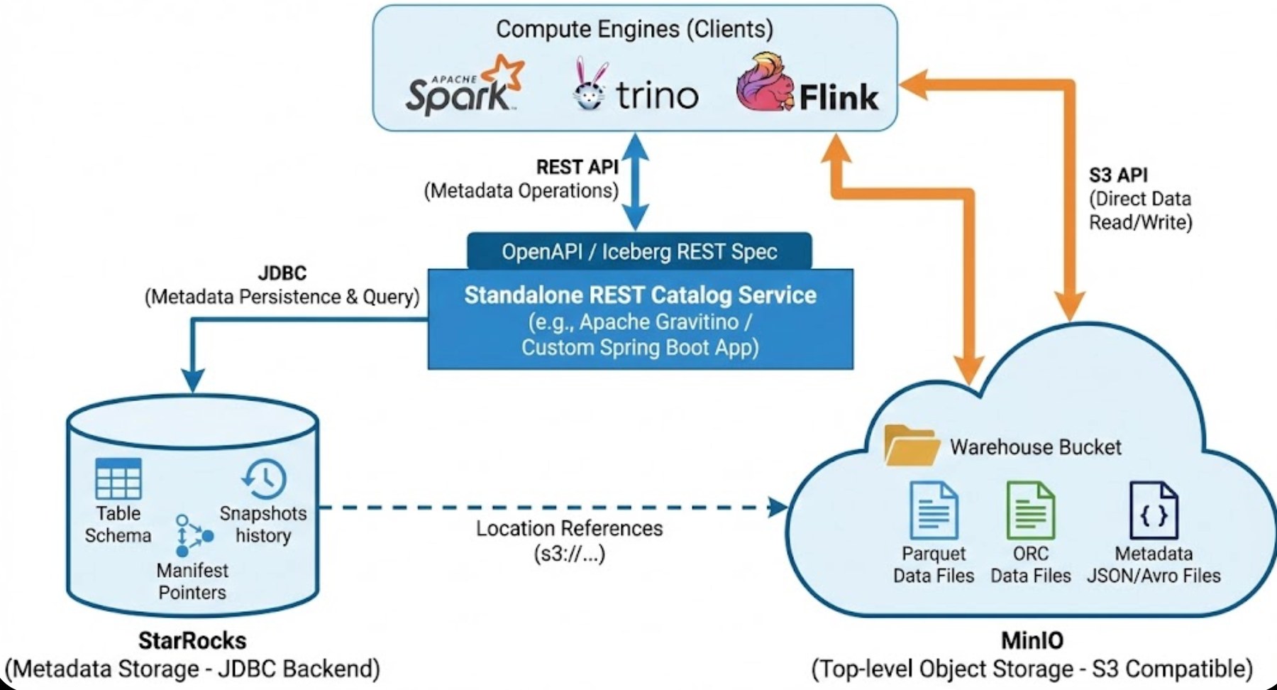 - REST Catalog 作为独立服务 :REST Catalog 不存储数据本身,而是作为一个接口层,连接后端元数据存储(如数据库)和底层对象存储(如 MinIO)。它可以部署为独立的 HTTP 服务,支持 OpenAPI 规范,便于客户端集成。