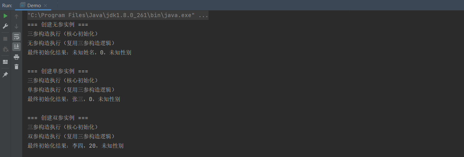 System.out.println("双参构造执行(复用三参构造逻辑)");
