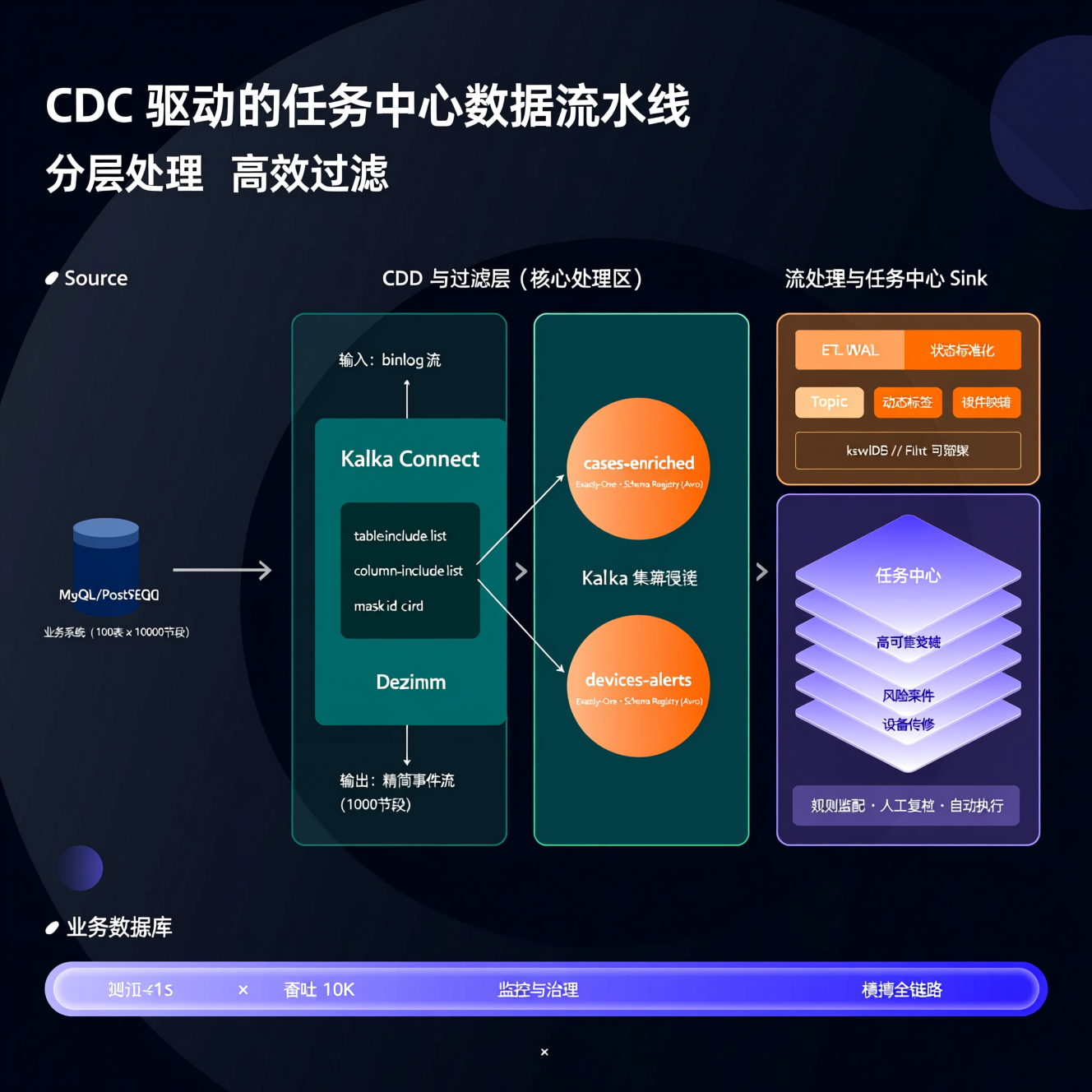 CDC 不是"另一种同步工具",而是构建实时数据管道的基础设施 。它通过事务日志实现零侵入、高可靠、低延迟的变更捕获,为任务中心提供高质量输入。结合分层过滤、轻量 ETL 与流处理,可构建可扩展、可运维、可进化的智能任务系统。