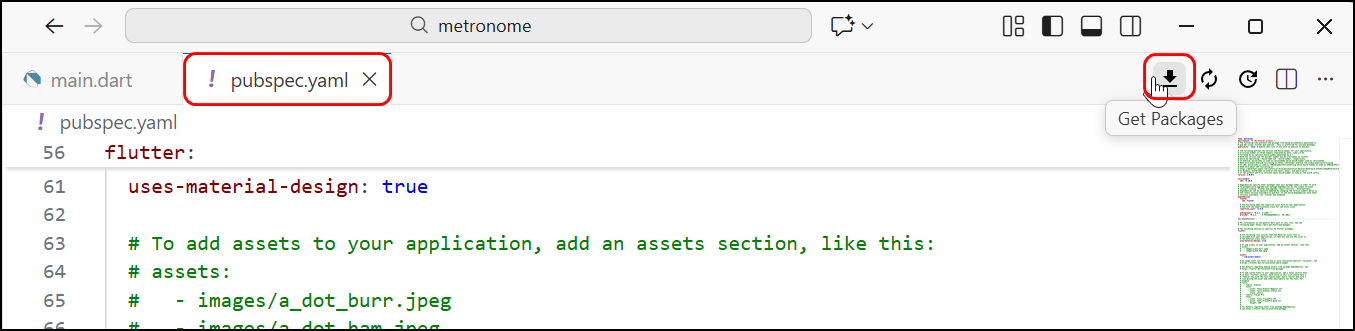 修改 pubspec.yaml 后需执行 flutter pub get,下载/更新声明的依赖包,解析并缓存资源路径。