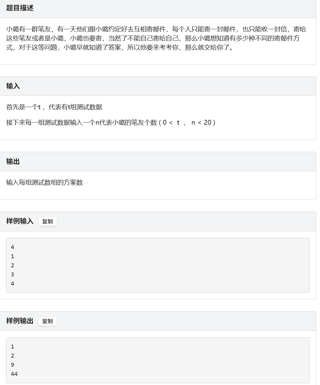 2.根据题目对笔友的范围,小璐最多有19个笔友,但是算寄信方式小璐自己也在内,所以加上小璐,一共20个笔友,那么依次计算。先考虑特殊情况,一个人都没有只有1种方式,只有1个人没有方式寄信。然后从2开始,计算到最大笔友数,这个计算是有公式的,也可以去了解公式的推导。然后确定笔友可能数的寄信方式数之后来确定每组测试数据的方式,注意这里输入的值是小璐笔友的数量,但是我们计算的时候也要加上小璐,所以总值加1,计算出一个输出一个,不过需要换行。