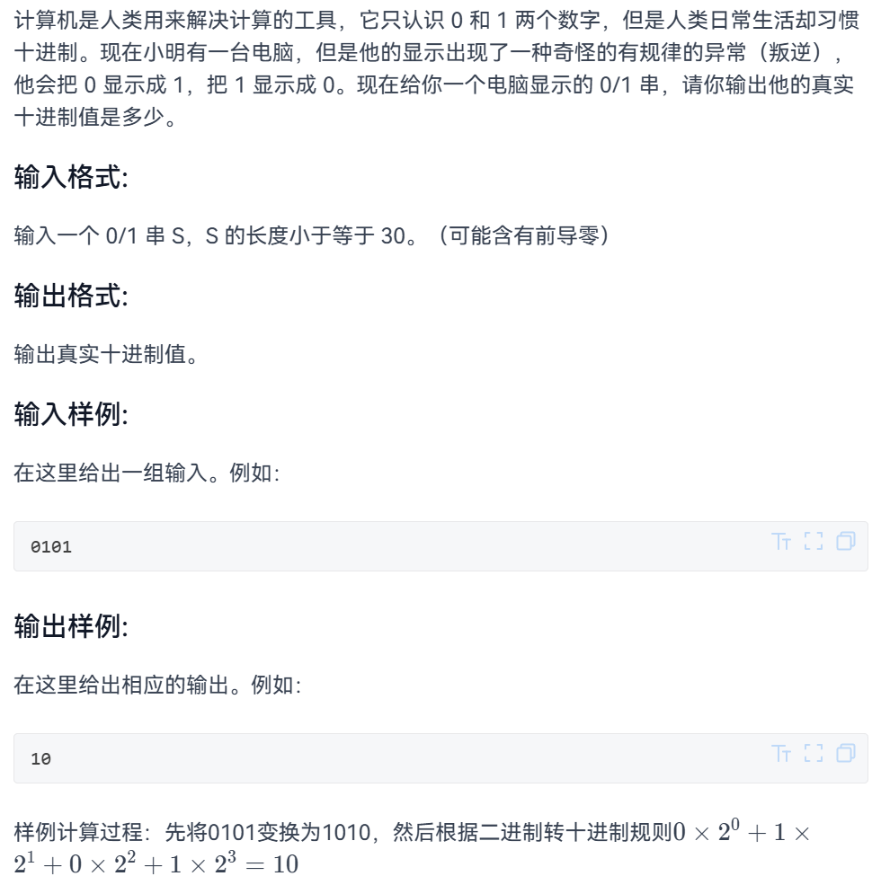 1.根据题目,我们先输入一串数字字符串,然后题目说计算机的原因,这个字符串原本的'1'是'0',原本的'0'是'1',那么我们先要将字符串转换一下,将'0','1'转变一下,得到新的字符串。