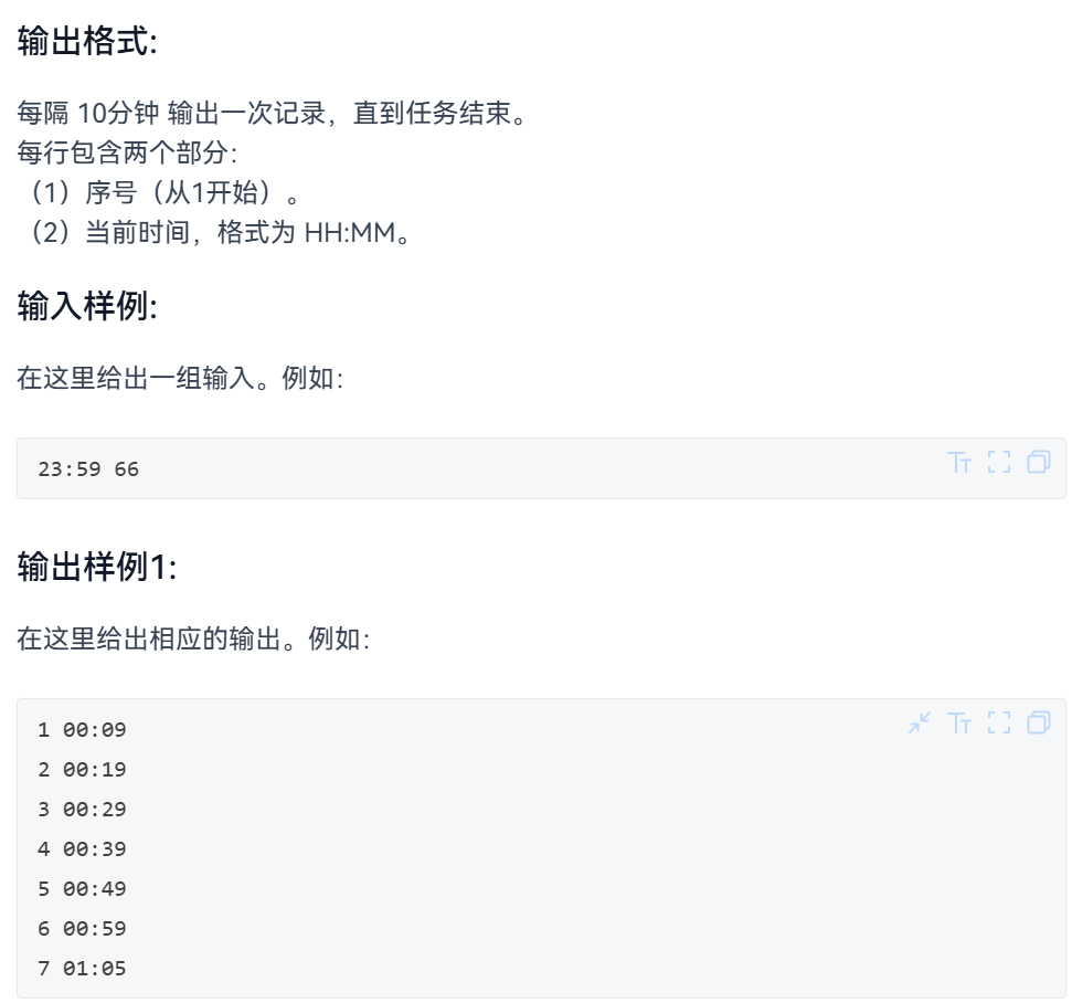3.注意输出的格式,先序号,然后空格,之后小时和分钟,不过小时和分钟都是需要两位数,不足两位数用0补,每次输出都需要换行。