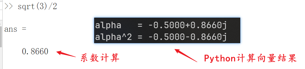 α=ej2π3=cos(2π3)+jsin(2π3)=−0.5+j32\alpha = e^{j\frac{2\pi}{3}} = \cos(\frac{2\pi}{3}) + j\sin(\frac{2\pi}{3}) = -0.5 + j\frac{\sqrt{3}}{2}α=ej32π=cos(32π)+jsin(32π)=−0.5+j23