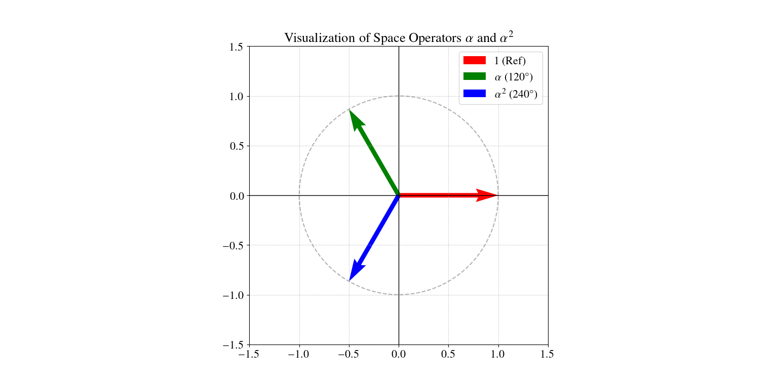 在交流电机理论中,α\alphaα 是一个单位空间算子(Space Operator)它代表在空间上逆时针旋转 120° 的单位矢量.