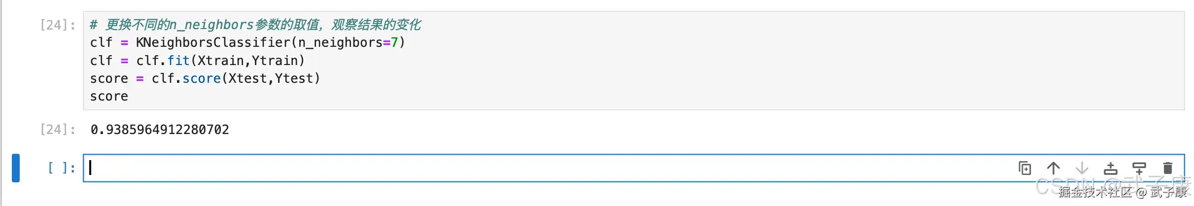 KNN 中的一个超参数,所谓"超参数",就是需要人为输入,算法不能通过直接计算得出这个参数,KNN 中的 K 代表的是距离需要分类的测试点 X 最近的 K 个样本,如果不输入这个值,那么算法中重要部分"选出 K 个最近邻"就无法实现。 从 KNN 的原理中可见,是否能够确认合适的 K 值对算法有极大的影响。