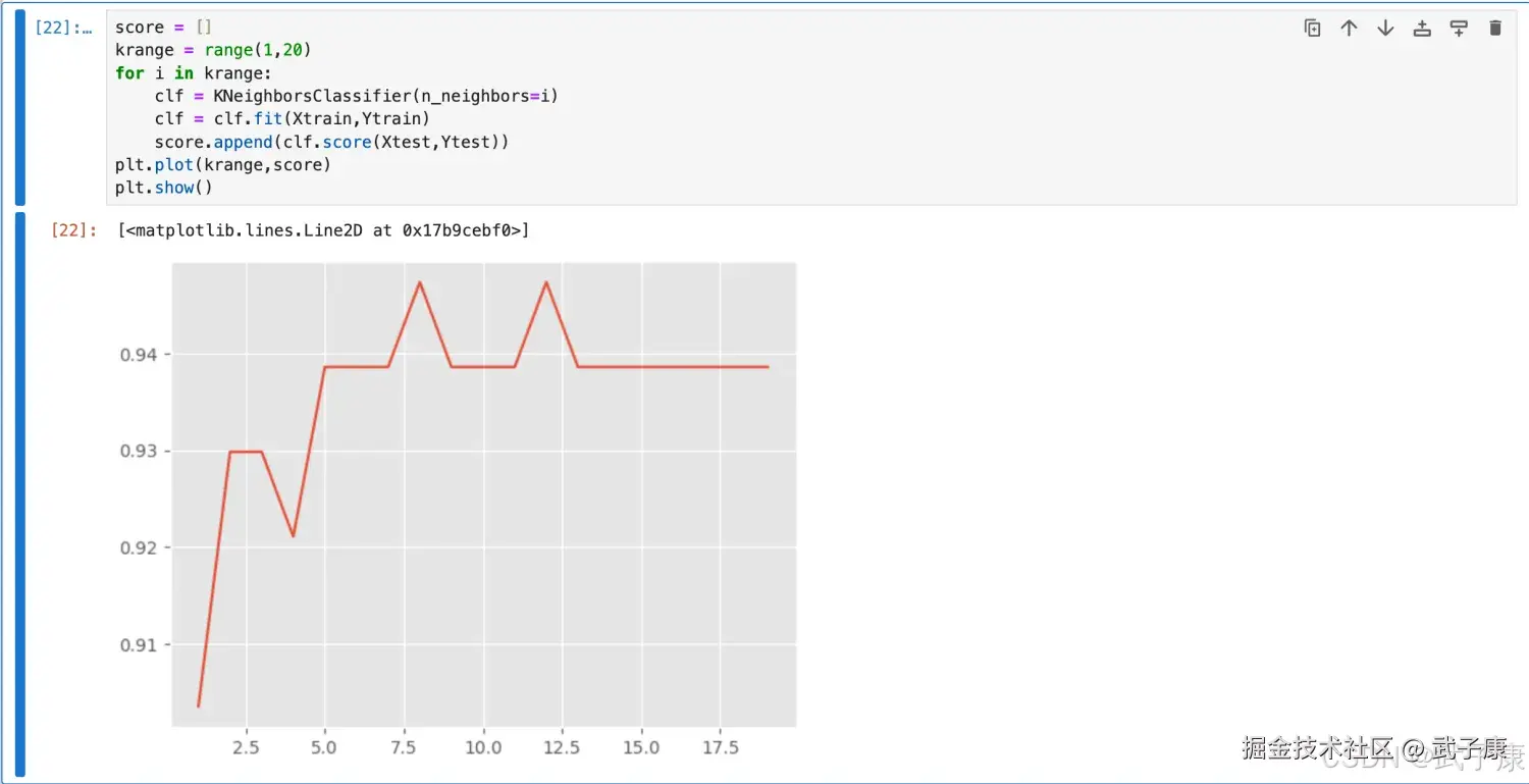 我们怎么样选择一个最佳的 K 值?在这里要使用机器学习中的神器:参数学习曲线,参数学习曲线是一条以不同的参数取值为横坐标,不同参数取值下的模型结果为纵坐标的曲线,我们往往选择模型表现最佳点的参数取值作为这个参数的取值。