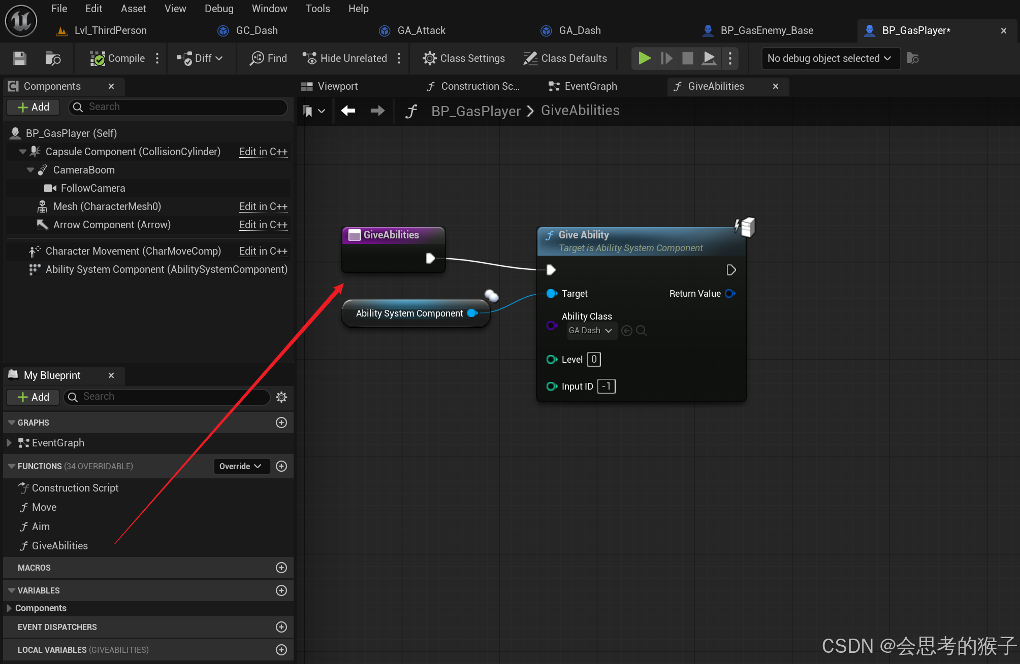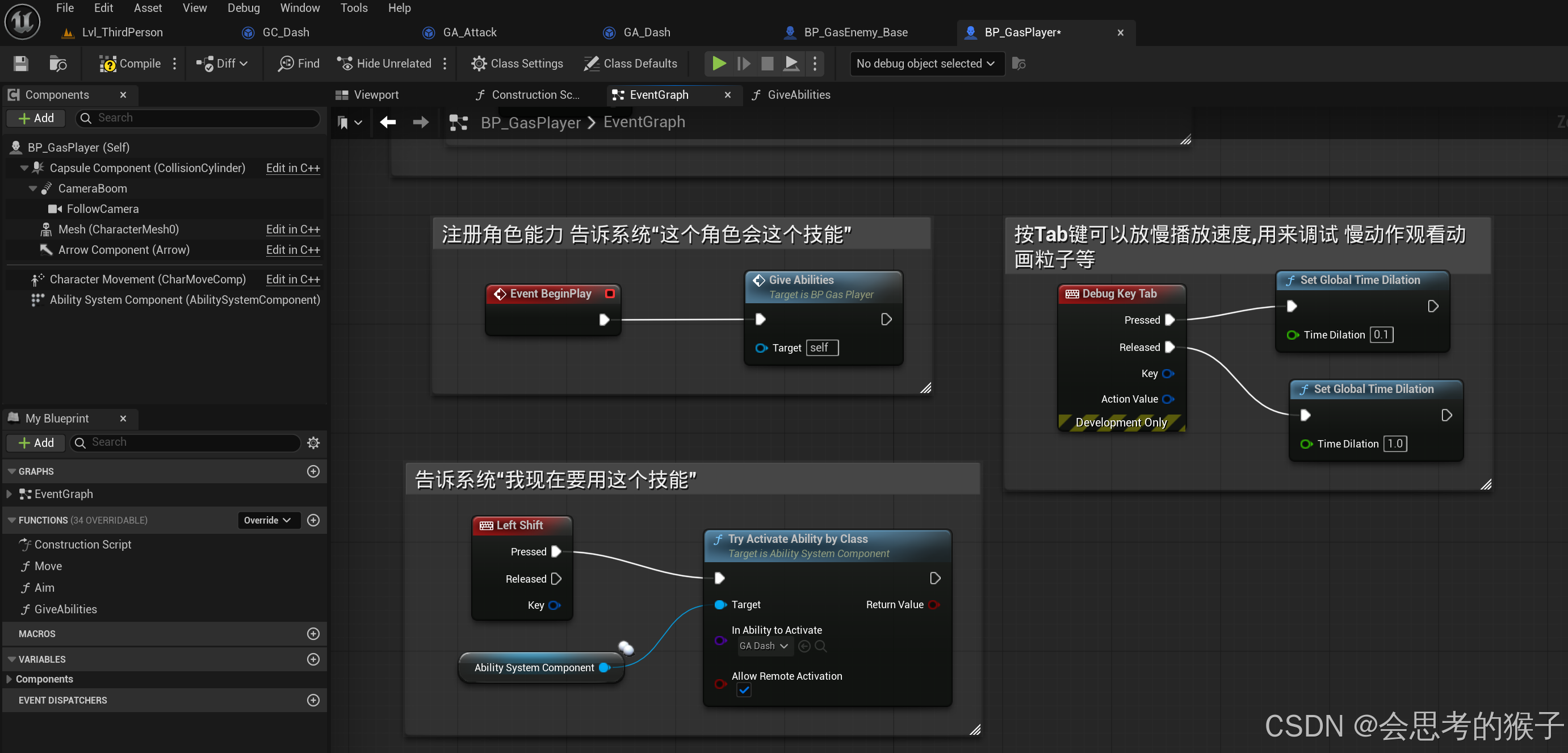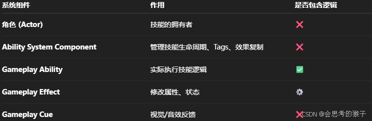 Gameplay Ability = "一个技能逻辑的蓝图/代码" 比如:Dash BP / Fireball BP / Heal BP
