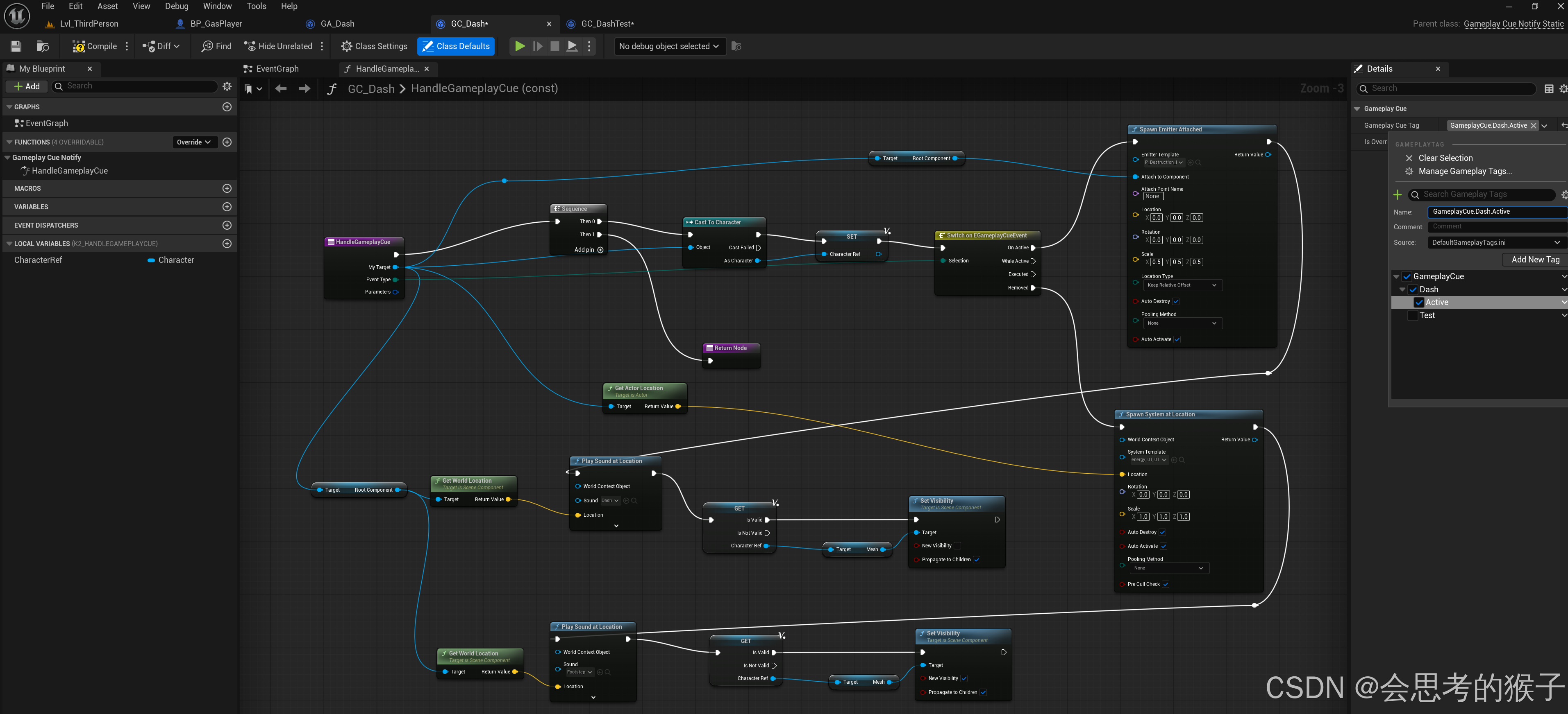 本文介绍了游戏技能GA_Dash的创建与实现过程。首先创建GameplayAbility并添加GameplayAbility.Movement.Dash标签,封装了GetDashDirection和GetMaxSpeed两个函数,其中GetDashDirection根据最近按键输入方向确定冲刺方向而非角色朝向。其次说明了如何向角色的AbilitySystemComponent注册该技能,包括技能赋予和手动触发机制。最后提及了蓝图类中GameplayCue的实现,包括添加HandleGameplayCueFunction和GameplayCue标签。整个流程涵盖了从技能创建到实际应用的关键步骤。