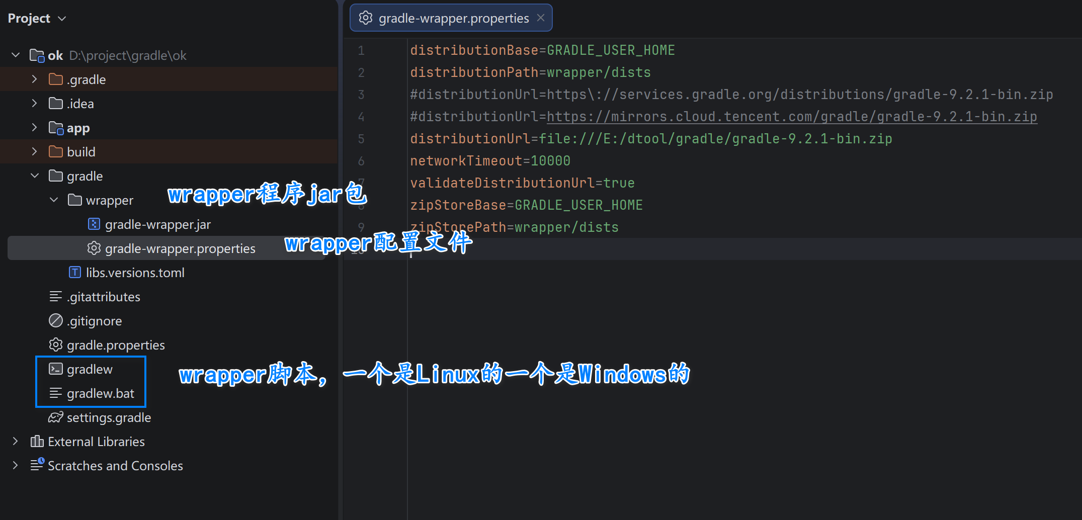 所以,通常在gradle项目中会使用一个gradle wrapper的东西,主要就是为项目指定gradle版本,这样当其他人拿到相同的项目去执行构建的时候,就自动去下载对应版本的gradle。