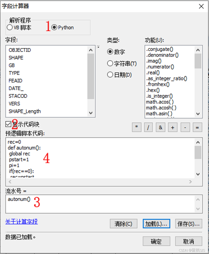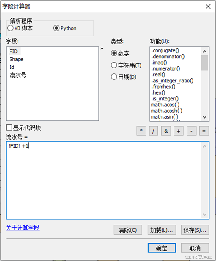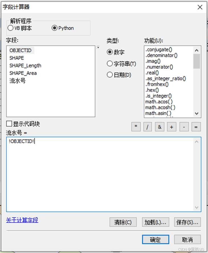 在字段计算器中点击加载,在打开对话框中选择流水号.cal文件,单击打开。