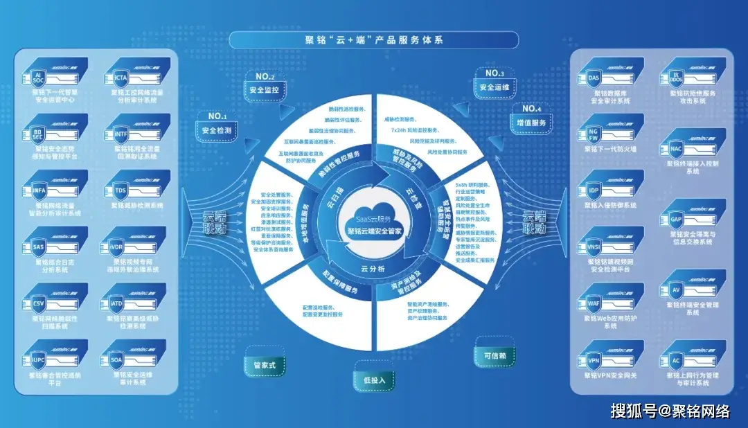 作为国内领先的安全运营商,聚铭网络始终聚焦客户安全需求,深耕网络安全领域,为客户提供全生命周期的网络安全解决方案与专业服务。公司构建了完备的"云+端"一体化产品服务体系,全面覆盖安全托管、安全管理、安全审计等核心场景,可在资产运维、漏洞识别与治理、合规监管等关键环节提供高效支撑,实现客户资产安全的全方位管控与持续优化。