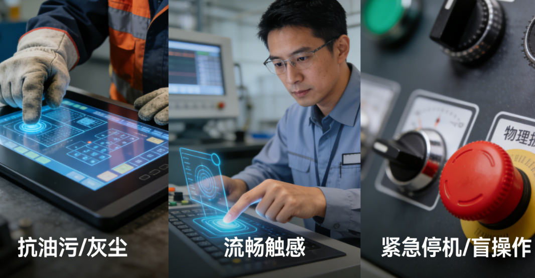 物理按键/旋钮:作为触摸屏的补充或冗余,在紧急停机(蘑菇头按钮)、模式切换、高频调节等需要盲操作或绝对可靠性的场合不可或缺。