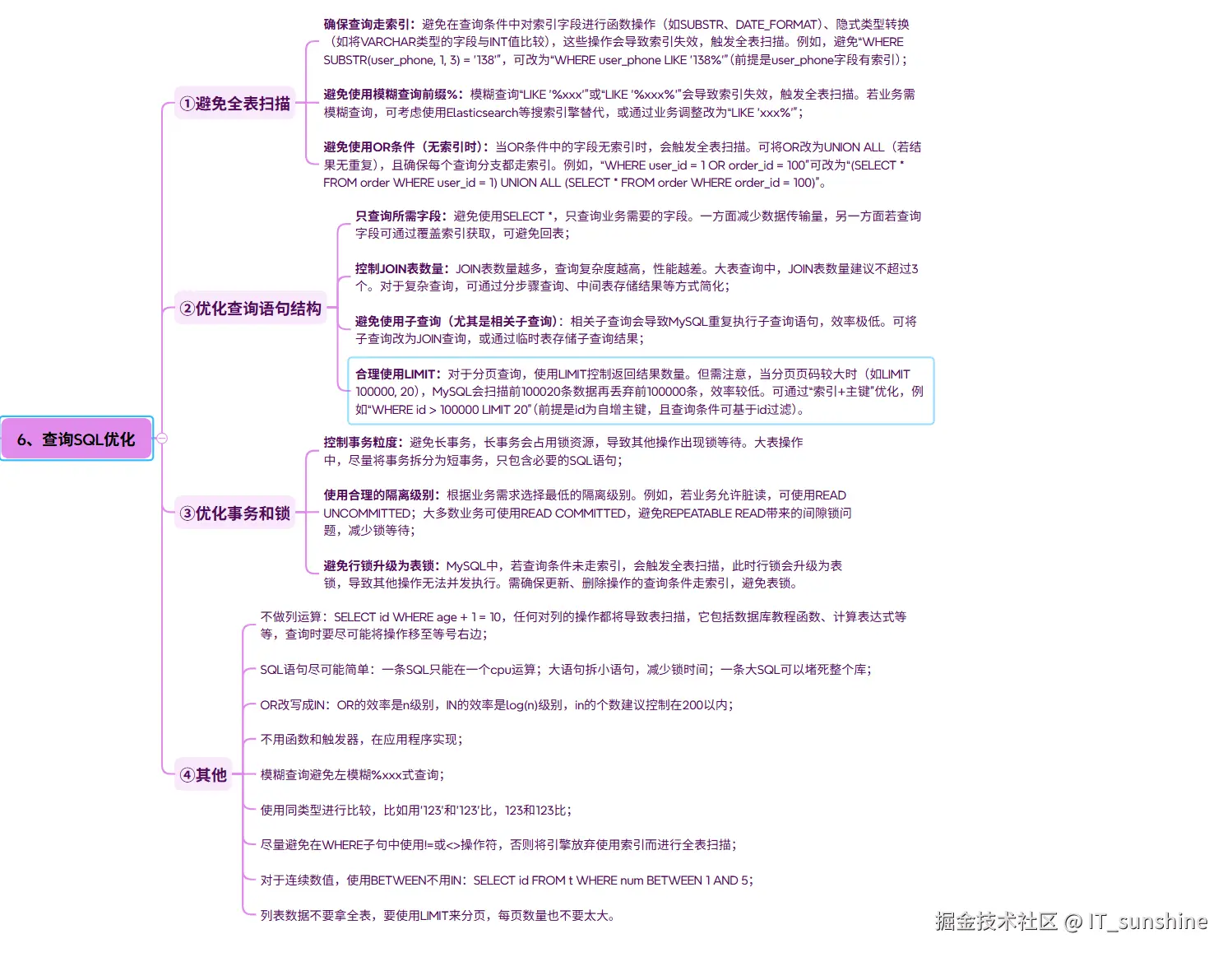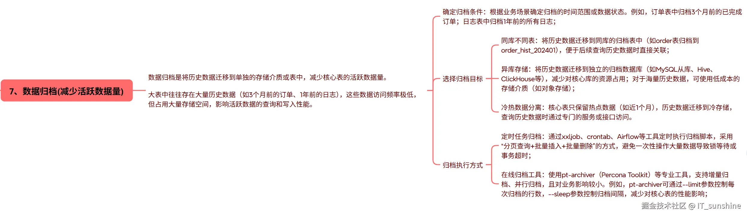 - 架构和运维层:通过分库分表、读写分离、数据归档等方式,分散单表压力,提升系统并发能力。