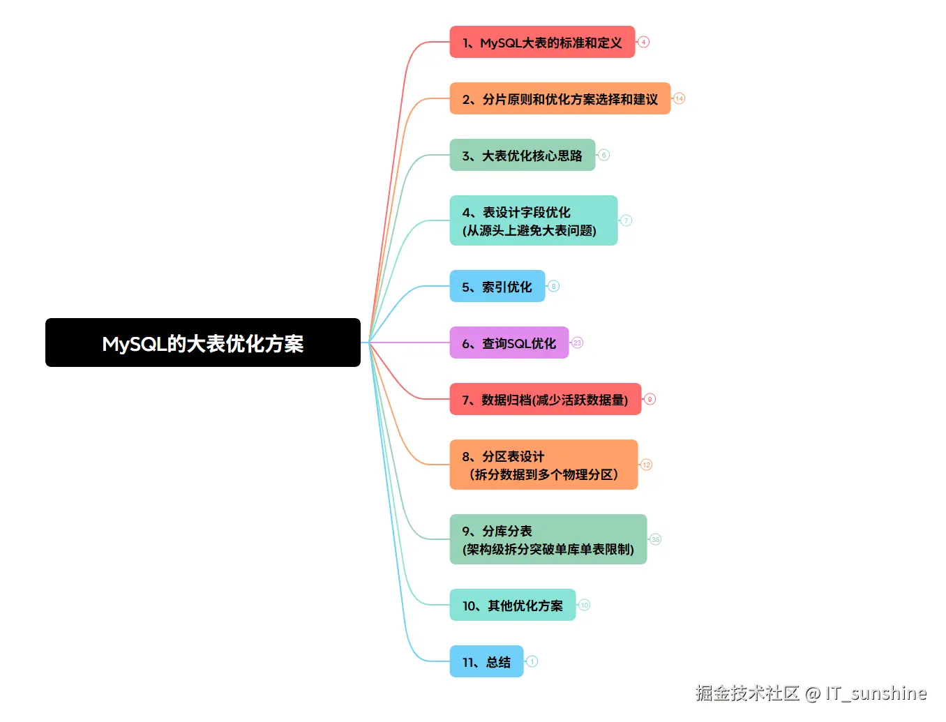 MySQL大表优化是一个系统性工程,需从表设计、查询、索引、数据归档、分区表、分库分表等多个维度综合考量,核心是"减少数据量、降低访问成本、分散压力"。优化过程中应遵循"先易后难、先软后硬"的原则,优先采用低成本、低风险的方案,再根据业务需求逐步升级到架构级优化。大厂的实战案例表明,优化方案需紧密结合业务场景:电商订单表适合分库分表+数据归档,日志表适合分区表+冷热分离,商品表适合垂直拆分+读写分离+缓存。同时,优化后的监控与运维至关重要,能确保系统长期稳定运行。好了,今天的分享就到此结束了,如果文章对你有所帮助,欢迎:点赞👍+评论💬+收藏❤ ,我是:IT_sunshine ,我们下期见!