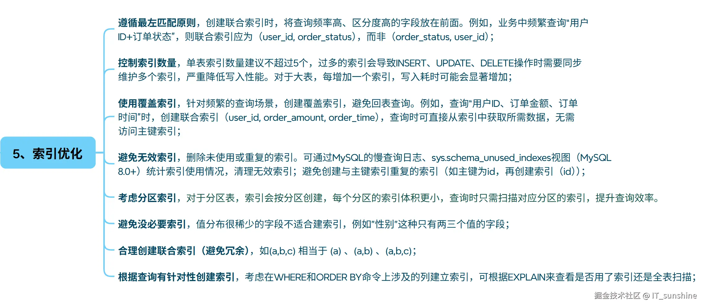 - 遵循最左匹配原则,创建联合索引时,将查询频率高、区分度高的字段放在前面。例如,业务中频繁查询"用户ID+订单状态",则联合索引应为(user_id, order_status),而非(order_status, user_id);