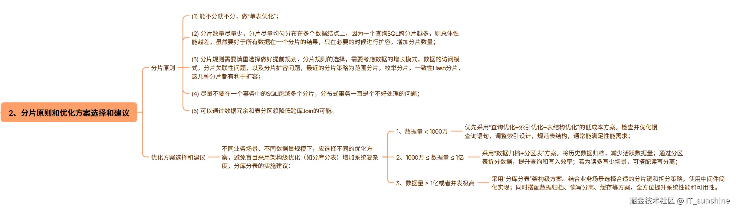 - 数据量 ≥ 1亿或者并发极高:采用"分库分表"架构级方案。结合业务场景选择合适的分片键和拆分策略,使用中间件简化实现;同时搭配数据归档、读写分离、缓存等方案,全方位提升系统性能和可用性。