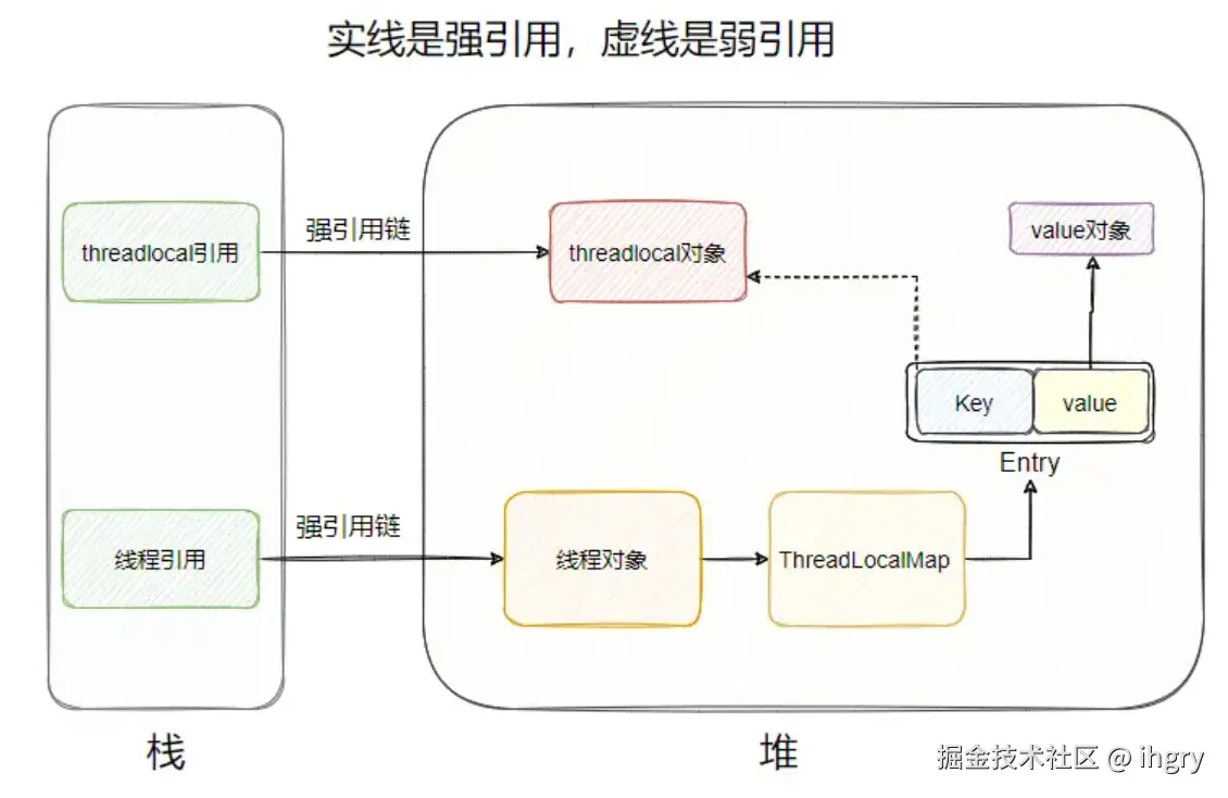 ThreadLocalMap中的key是弱引用,之所以不是强引用是因为所使用的线程往往是线程池中的线程,线程一般不会被销毁,对ThreadLocal的引用就会一直存在,导致内存释放不掉 -