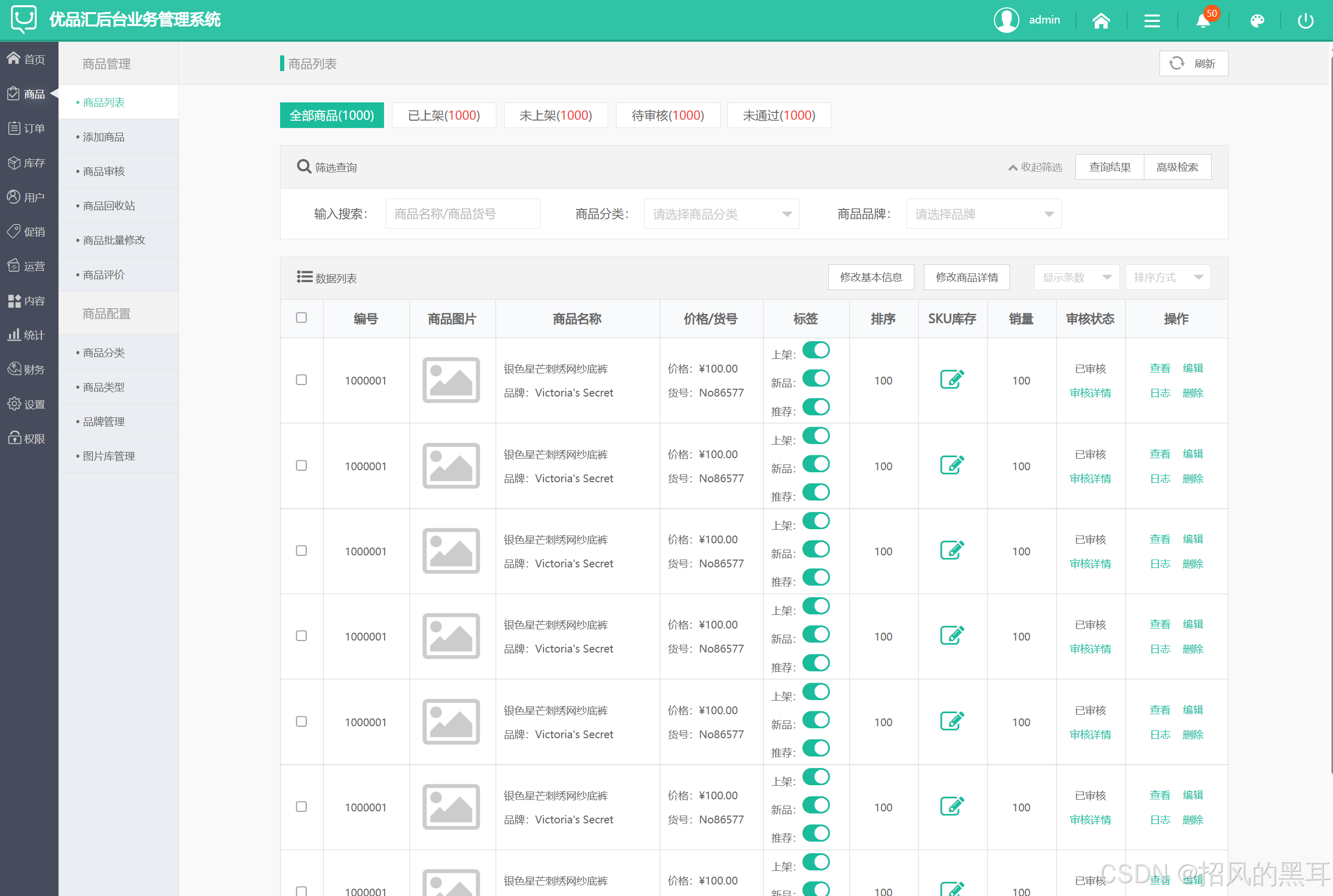 商品管理模块:该模块是商城运营的基础,包含了商品列表展示、商品添加、审核流程、回收站管理、批量修改、评价管理、配置设置、分类与类型划分、品牌管理以及图片库管理等全面功能。每一项功能都经过精心设计,确保商品信息的录入、编辑、审核及展示流程顺畅无阻。