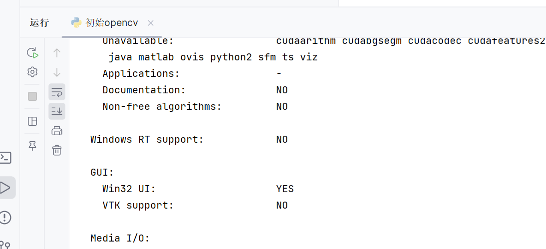 了解到Qt后端对中文编码的支持更好,于是打算切换Qt后端。但在检查OpenCV编译信息时发现,我的版本根本没有集成Qt模块:
