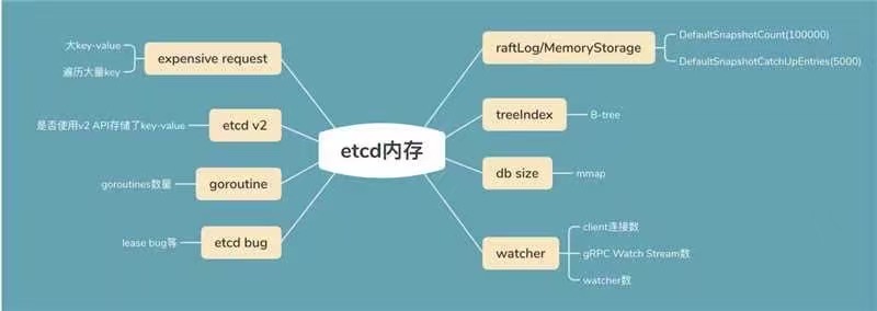 这次通过一个写入1MB key的实际案例,介绍了可能导致etcd内存占用高的核心数据结构、场景,同时我将可能导致内存占用较高的因素,总结为下面这幅图。